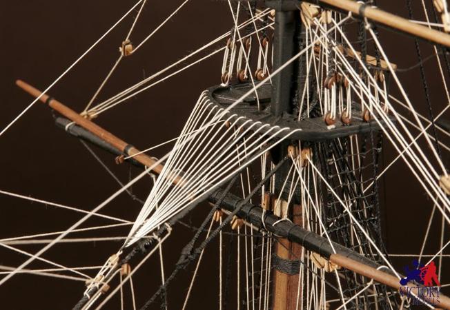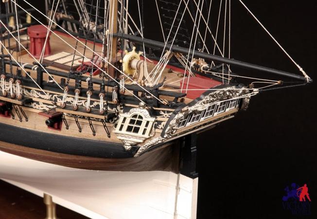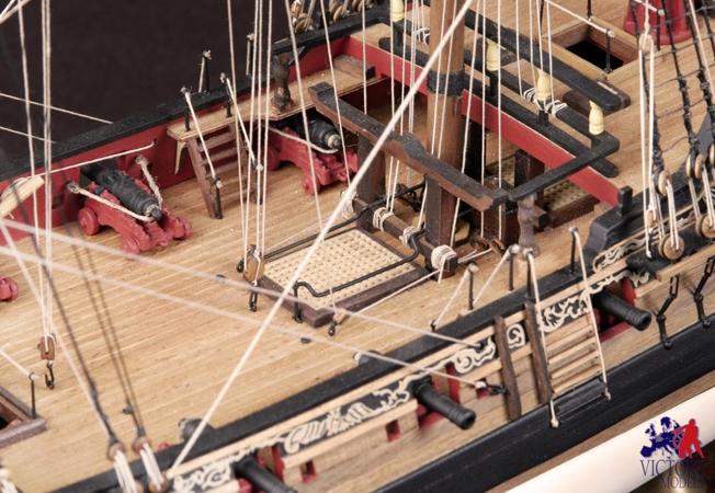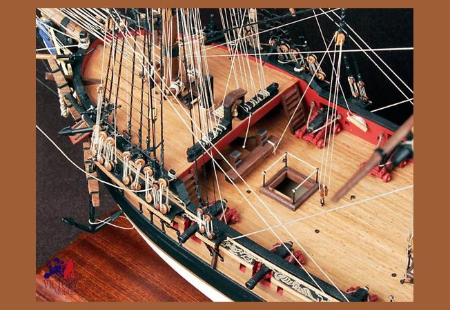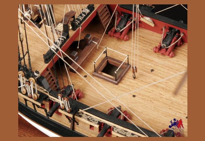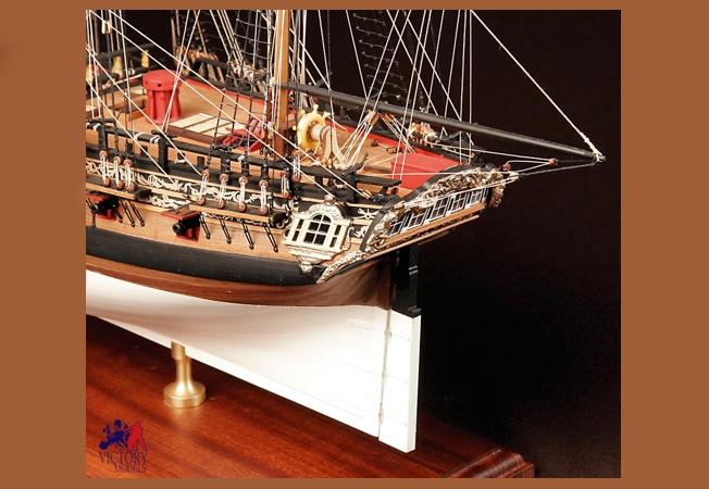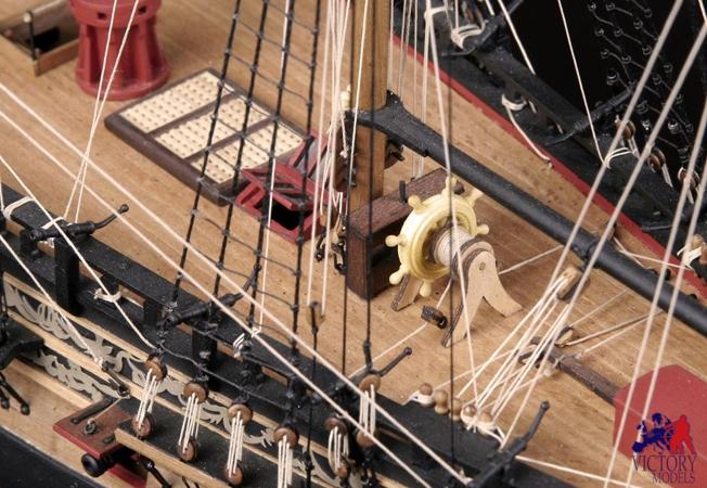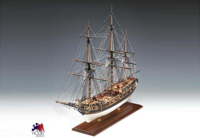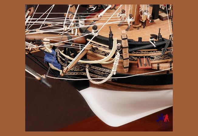 H.M.S. Fly was the fifth of twenty-five Swan Class sloops built between 1766 and 1780. Fly was commissioned by the Admiralty on the 1st of August 1775 and designed by the Williams shipyard. Her keel was laid in January 1776 at the Sheerness shipyard, and she was completed in September 1776, the month of her launch. During her career she served as an escort and dispatch vessel. She once captured a French Corsair, the Greneur, off Portland after a long chase, and in 1800 captured another, the Trompeur, at La Hague. The Swan Class sloops with their sleek lines and fine decoration, measured 97' 7" with a displacement of 300 tons. They were crewed by 125 officers and men. The model is based on the official plans and original drawings. Code: 1300/03 Scale: 1:64 Length: 80 cm